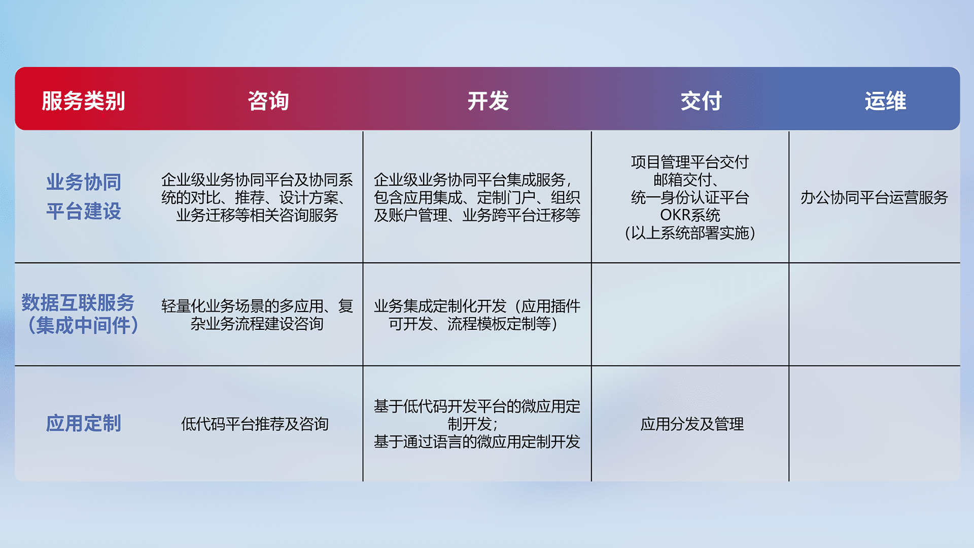 针对钉钉、、、企微、、、、IDaas等平台级产品提供产品的规划、、、方案、、、交付、、定制化开发等服务,,,,实现如统一协同办公、、智能客户服务、、、混合会议管理、、、智能数据查询、、、、等业务场景,,,,实现数字化转型。。